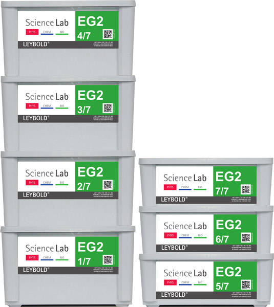 Schülerexperimentierblock des Schülerversuche-Systems Science Lab im Bereich Physik. Aufbaumaterial für  4 Arbeitsgruppen in nach Geräten sortierter Aufbewahrung. Mit dem Geräteblock EG2 können  mehr als 20 Versuche in der S   I und S   II durchgeführt werden.