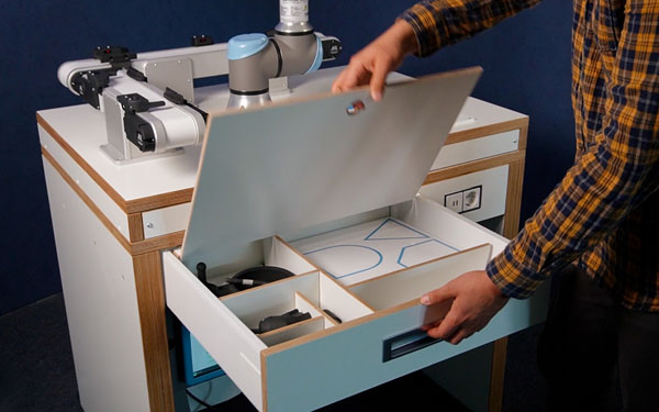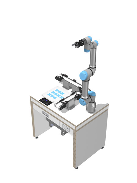 La cellule de formation UR5e Starter offre une introduction idéale au travail avec des robots industriels collaboratifs (ou cobots). Les nombreuses fonctionnalités de sécurité du cobot permettent de mener des expériences innovantes et sûres dans votre laboratoire. Notre système offre une solution complète comprenant un cobot avec ses accessoires, ainsi qu'un établi optimisé pour cette application, avec alimentation électrique, tous les supports nécessaires pour l'unité de commande, la tablette de programmation et le cobot, et un espace de rangement suffisant pour les accessoires nécessaires.