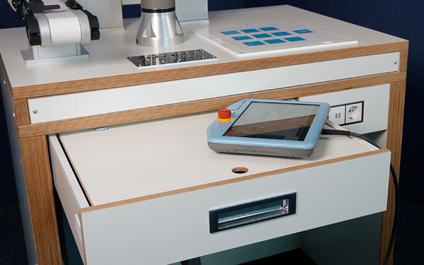 Le cobot peut être commandé et programmé à l'aide de l'écran tactile 12 pouces inclus dans la livraison. De plus, la programmation des mouvements s'effectue via un bouton d'apprentissage, qui permet de programmer le cobot en spécifiant un modèle de mouvement exécuté manuellement d'une simple pression sur un bouton.