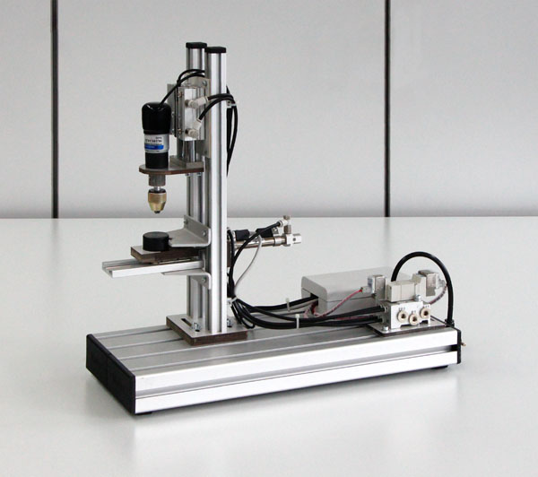 Le module mécatronique Usinage Perçage BAB avec variateur de vitesse réalise l'usinage de pièces. Il dispose à cet effet d'un entraînement avec mandrin pour simuler le perçage. Cet ensemble peut être abaissé ou relevé pneumatiquement. La pièce à usiner se trouve sur un chariot porte-pièce coulissant et peut ainsi être amenée à la perceuse où elle est serrée pneumatiquement.