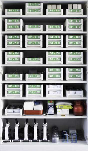 Une partie des tiroirs contient des produits chimiques. Certains d'entre eux ne peuvent être stockés que dans une armoire à ventilation passive, par exemple l'armoire recommandée