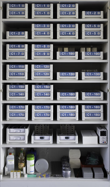 Une partie des tiroirs contient des produits chimiques. Certains d'entre eux ne peuvent être stockés que dans une armoire à ventilation passive, par exemple l'armoire recommandée