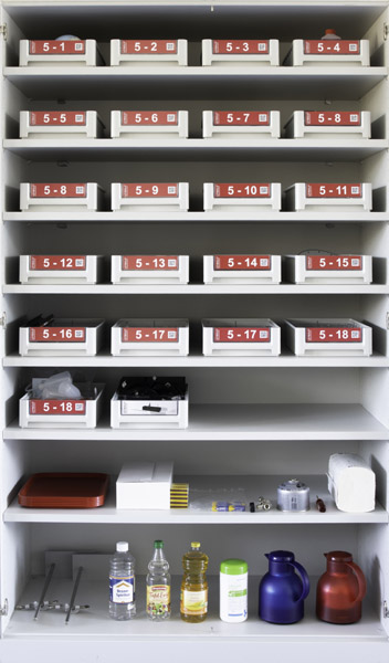 Une partie des tiroirs contient des produits chimiques. Certains d'entre eux ne peuvent être stockés que dans une armoire à ventilation passive, par exemple l'armoire recommandée