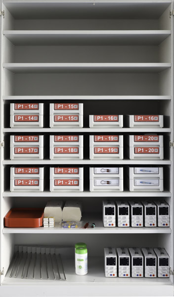 Une partie des tiroirs contient des produits chimiques. Certains d'entre eux ne peuvent être stockés que dans une armoire à ventilation passive, par exemple l'armoire recommandée