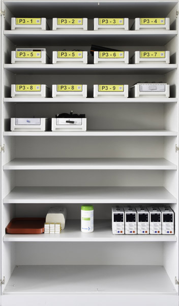Une partie des tiroirs contient des produits chimiques. Certains d'entre eux ne peuvent être stockés que dans une armoire à ventilation passive, par exemple l'armoire recommandée