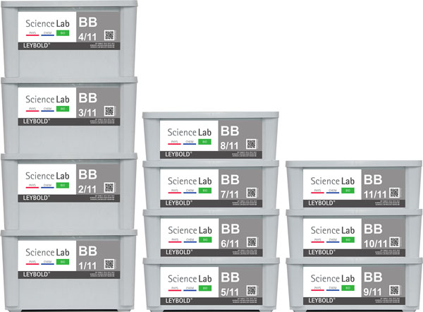 Bloc pour les travaux pratiques avec le système d'expériences pour élèves Science Lab. Matériel de montage trié par composant pour plusieurs groupes de travail correspondant à la taille de bloc choisie, le tout rangé dans une boîte.