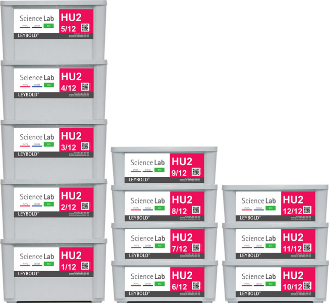Bloc pour les travaux pratiques avec le système d'expériences pour élèves Science Lab. Matériel de montage trié par composant pour plusieurs groupes de travail correspondant à la taille de bloc choisie, le tout rangé dans une boîte.