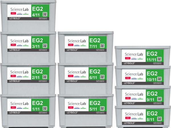 Bloc pour les travaux pratiques avec le système d'expériences pour élèves Science Lab. Matériel de montage trié par composant pour plusieurs groupes de travail correspondant à la taille de bloc choisie, le tout rangé dans une boîte.