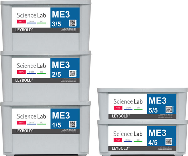 Bloc pour les travaux pratiques avec le système d'expériences pour élèves Science Lab. Matériel de montage trié par composant pour plusieurs groupes de travail correspondant à la taille de bloc choisie, le tout rangé dans une boîte.