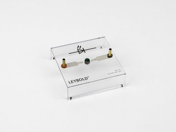 Socle transparent avec LED verte. Pour les très basses tensions. Connexion aussi bien pour les câbles d'expérimentation avec fiche ouverte de 4 mm que pour les câbles d'expérimentation de sécurité.