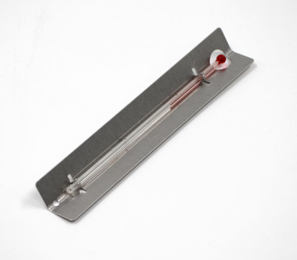 Thermomètre pour étudiants sur équerre métallique sans graduation. Remplissage rouge sans mercure.